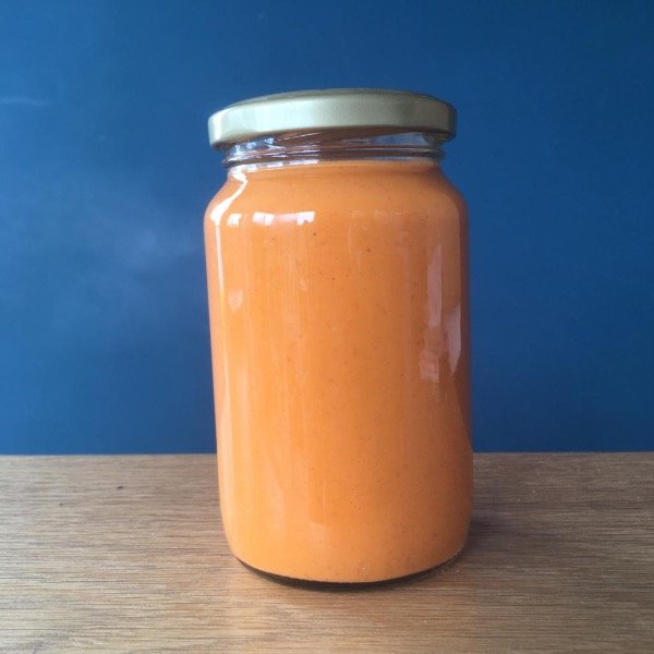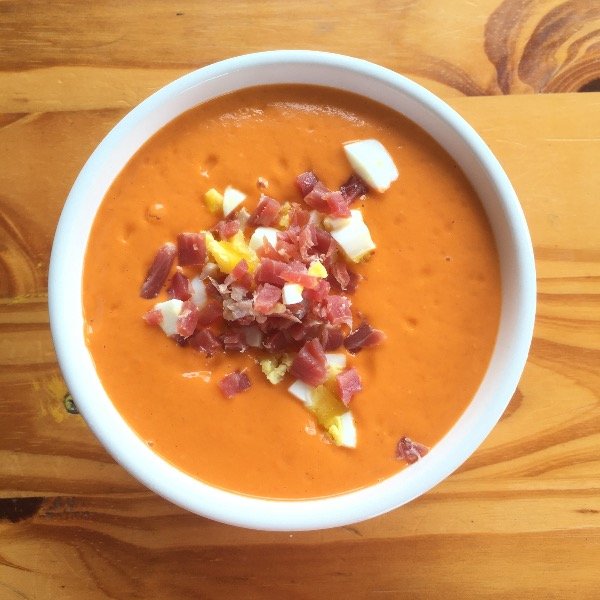 Sopa fría espesa de tomate, pan de masa madre y ajo con aceite de oliva y sal rosada. Tamaño del frasco 660 cc. Rinde 2 porciones.