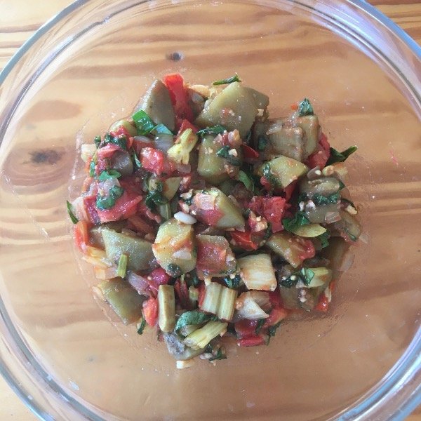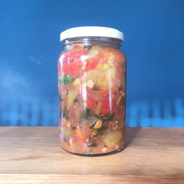Guiso de verano con berenjena, cebolla, ajo, apio, tomate, aceitunas, nueces, albahaca, aceite de oliva y sal rosada. Se entrega fresco en frasco de vidrio de 660 ml. Rinde 2 porciones. Se come frio o caliente, solo o como guarnición.
