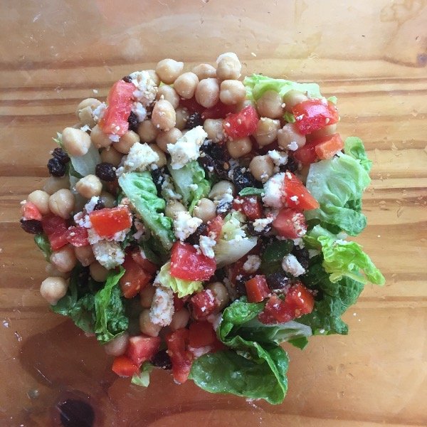 Garbanzos, tomate perita, pasas de uva, queso de cabra, sésamo y albahaca.