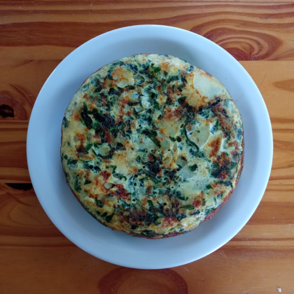 Tortilla a base de papa, cocinada en aceite de oliva virgen extra, huevo pastoril, espinacas y sal rosada. Rinde para 2 personas. Diámetro 20 cm.