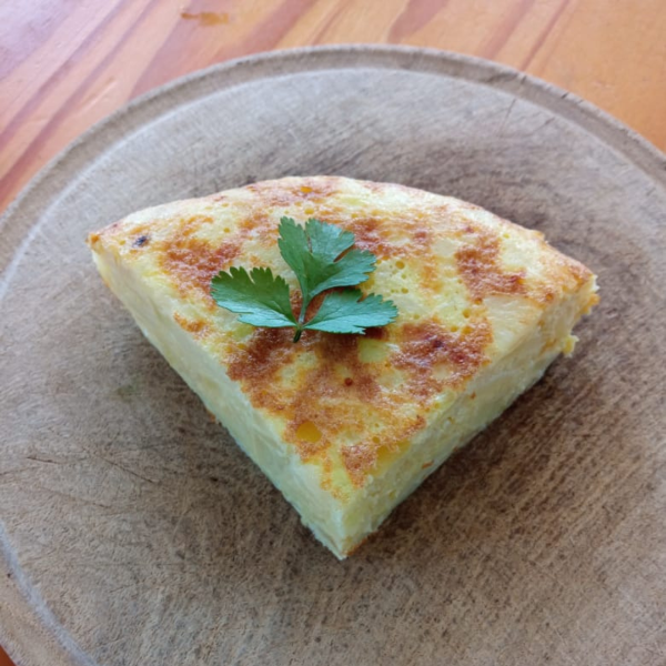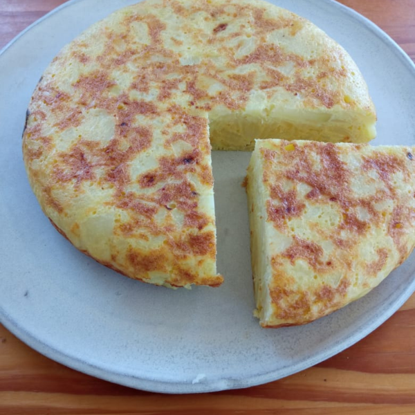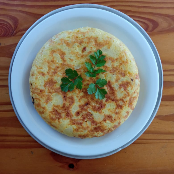 Tortilla a base de papa, cocinada en aceite de oliva virgen extra, huevo pastoril y sal rosada. Rinde para 2 personas. Diámetro 20 cm.